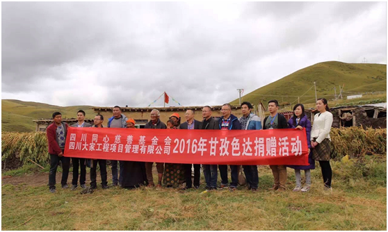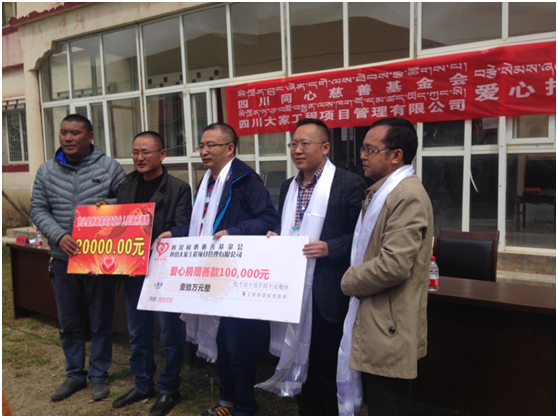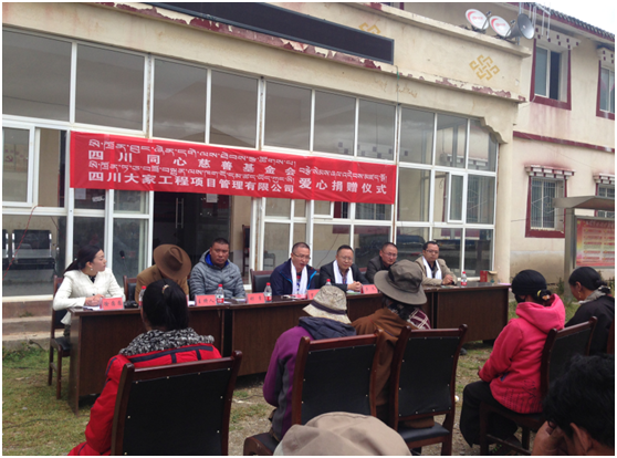 四川同心慈善理事长罗钢、理事龚冬、色达县财政局局长、亚龙乡党委书记刚索就坐后,捐赠仪式正式开始。此次捐赠活动中,四川同心慈善基金会、四川大家工程项目管理有限公司携手为甘孜州色达县亚龙乡捐赠10万元,大家都有着共同的愿望,希望此行能够给当地藏族同胞带来帮助。
