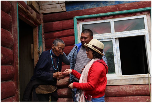 仪式结束后,在亚龙乡党委书记刚索的带领下,我们首先来到藏族老乡常托家。据了解老人家常年和孙女住在一起,女儿外出打工,小孙女还在读小学,婆孙俩人相依为命。常托老人早年断臂,右脚也因过度劳作变形。进入老人家中,但见家徒四壁,因贫困只养有三头牛和一只狗,院里晒有少量粮食。接过基金会理事长罗钢代表基金会送去的慰问品及慰问金,常托老人流下了感动的泪水,在场的志愿者也纷纷送上了自己的一点心意。老人家不懂汉语,但是依然竖起大拇指一直说着我们也听不懂的藏语,经一旁懂藏语的朋友翻译原来她是在说“谢谢”。临走,老妈妈一直目送我们离开,我们想说“老人家,坚强生活,我们的心和您在一起。”