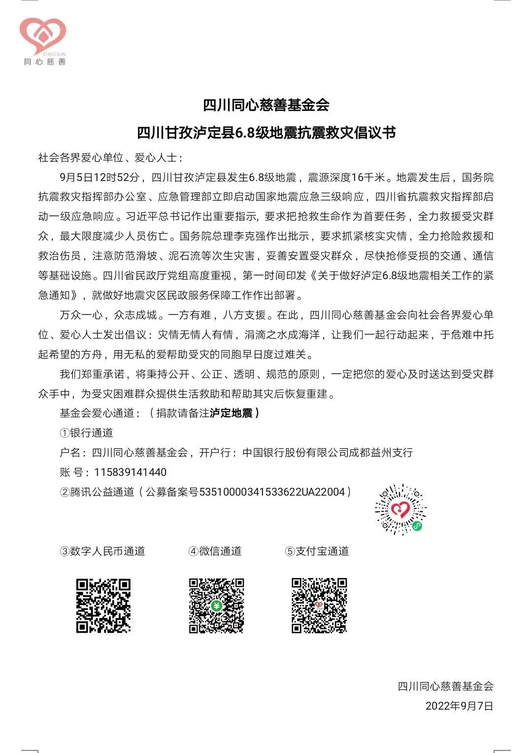 四川甘孜泸定县6.8级地震 抗震救灾倡议书